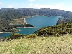 The outer caldera dates from between 30,000 and 45,000 years ago, and comprises an area 4 kilometres (2.5 mi) wide and 13 kilometres (8.1 mi) long outer caldera (corresponding to the Água de Pau Massif).[2] The inner caldera, which is 2.5 kilometres (1.6 mi) wide and 3 kilometres (1.9 mi) long was formed about 15,000 years ago. It is the younger inner caldera that is partially filled by the crater lake Lagoa do Fogo.[1]