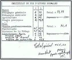 This means that aspiring teachers had to finance all or part of their short studies at a normal school themselves unless they were eligible for all or part of a municipal, departmental, or state scholarship. At the end of these short studies, they must obtain a "certificate of proficiency"[13] to be entitled to teach.