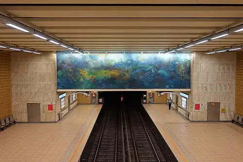 Étangs Noirs (French, pronounced [etɑ̃ nwaʁ]) or Zwarte Vijvers (Dutch, pronounced [ˈzʋɑrtə ˈvɛivərs]) is a Brussels Metro station on lines 1 and 5. It is located at the border between the municipalities of Koekelberg and Molenbeek-Saint-Jean, in the western part of Brussels, Belgium. The station's name translates into English as "Black Ponds".