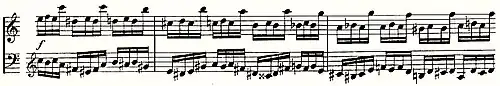 In Robert Schumann's 1836 Neue Zeitschrift für Musik article on piano études,[15] the study is classified under the category "speed and lightness" [Schnelligkeit und Leichtigkeit]. Collet remarks that the procedure of transferring the semiquaver figuration from one hand to the other, common in Bach but rare in Chopin, "makes great demands on the left hand." Chopin [in other works] rarely treats the left hand "as if it were a second right hand."[16] Chopin's zigzag configuration of the semiquaver line hardly allows usage of the standard C♯ minor scale fingering and invites pianists to use their thumb on black keys, treating them just like white ones. The result is a general absence of finger crossings, thus facilitating a quicker tempo. French pianist Alfred Cortot (1877–1962) states that the main difficulty to overcome is "regularity and briskness of attack" and the [very quick] alternation of narrow and wide hand positions.[17] His preliminary exercises commence to address the narrow and wide positions separately.