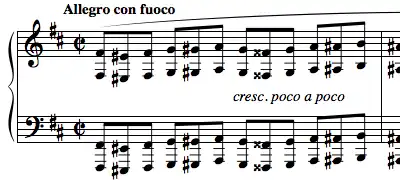 Copious pedal point notes and phrase markings are present in the second theme, but the entire étude lacks any pedal indications. Similar to the Op. 10, No. 4 étude, Chopin emphasizes legato playing through the phrasing and (lack of) pedal marking. Throughout the entire work, Chopin marks only five dynamic markings; the entire first theme is to be played forte to fortissimo, and the whole second theme is piano.[1]
