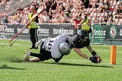 WR Johannes Lindéus for the Örebro Black Knights scoring a touchdown in the 2021 Superserien Final against the Stockholm Mean Machines.