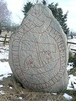 Ship images appear on several Viking Age runic inscriptions. Other runic inscriptions from the Viking Age which depict ships include DR 77 in Hjermind, DR 119 in Spentrup, DR 220 in Sønder Kirkeby, DR 258 in Bösarp, DR 271 in Tullstorp, DR 328 in Holmby, DR EM85;523 in Farsø, Ög 181 in Ledberg, Ög MÖLM1960;230 in Törnevalla, Sö 122 in Skresta, Sö 154 in Skarpåker, Sö 158 in Österberga, Sö 164 in Spånga, Sö 351 in Överjärna, Sö 352 in Linga, Vg 51 in Husaby, U 370 in Herresta, U 979 in Gamla Uppsala, U 1052 in Axlunda, U 1161 in Altuna, and Vs 17 in Råby.[1] Three stones, the Hørdum and Långtora kyrka stones and U 1001 in Rasbo, depict ships but currently do not have any runes on them and may never have had any.[1]