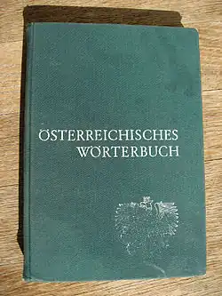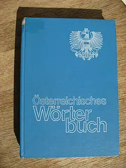 The Österreichisches Wörterbuch (Austrian German pronunciation: [ˈøːstɐraɪçɪʃəs ˈvœrtɐˌbuːx] ⓘ; lit. 'Austrian Dictionary'), abbreviated ÖWB, is the official spelling dictionary of Standard German in Austria, i.e. of Austrian Standard German. It has been edited since 1948 by a group of linguists under the authority of the Austrian Federal Ministry of Education, Arts and Culture (Bundesministerium für Unterricht, Kunst und Kultur) and contains a number of terms unique to, distinct or characteristic for Austrian German. Such Austrianisms may be more frequently or differently used or pronounced compared to other German-speaking areas.[1] A considerable amount of this Austrian vocabulary is also common in Southern Germany, especially Bavaria, and some of it is used in Switzerland as well. The most recent edition is the 44th from 2022. Since the 39th edition from 2001 the orthography of the ÖWB was adjusted to the German spelling reform of 1996.