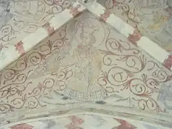 The murals in the chancel are from the middle of the 15th century and unusually well-preserved with vivid colours and sharp contours. They depict the four saints Barbara, Gertrude, Olaf and Canute. The baptismal font of the church is from the late 12th century and originally perhaps belonged to another medieval church, Västra Vrams kyrka, which was demolished in the 19th century and replaced with a new building. The font has carved floral ornamentation, and has on stylistic grounds been attributed to the Romanesque artist Tove. The other furnishings are considerably younger; the pews are partially from 1611 but mostly from the 19th century, and the richly decorated wooden pulpit is from 1636.[1][2]