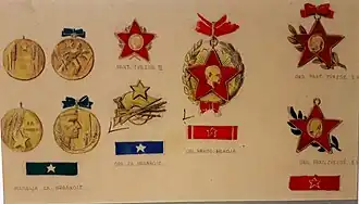 During his stay in Jajce and later in Drvar, in the winter and spring of 1944, Kun worked together with Augustinčić on the creation of conceptual sketches for the first partisan awards established in May 1943. He created conceptual solutions for the Order of the People's Hero, the Order of People's Liberation, the Order of Brotherhood and Unity, the Order of the Partisan Star in three rows, the Order for Courage and the Medal for Courage. Augustinčić went to the Soviet Union with Kun's drawings and in the summer of the same year the first partisan decorations were produced in Moscow. At the suggestion of Ivan Milutinović, commissioner for the National Economy in the NKOJ, in April 1944, he produced the first partisan postage stamp in Drvar. During Operation Rösselsprung on 25 May 1944, Kun's residence was burned down and many of his paintings and graphic works were burned. He managed to preserve a couple paintings, sketches and his drawing pad in his bag. After the liberation he made a set of graphics titled Partisans (Partizani) using sketches made during the war. One of the works from the set is Kurir Jovica, which represents a boy-fighter with an oversized overcoat, boots and a stern facial expression, which over time became a graphic symbol of the youth of Yugoslavia in the War of National Liberation. To create this sketch, Kun was helped by fifteen-year-old Jovan Tolomir, from the village of Podorugla, near Mrkonjić Grad, who was a courier of the Supreme Headquarters.[29][30]
