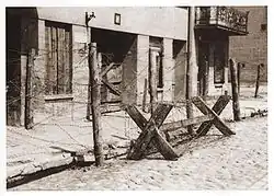 To ensure no contact between the Jewish and non-Jewish populations of the city, two German Order Police battalions were assigned to patrol the perimeter of the ghetto, including the Reserve Police Battalion 101 from Hamburg.[15] Within the ghetto, the Jewish Police force was created to ensure that no prisoners tried to escape. On 10 May 1940 orders went into effect prohibiting any commercial exchange between Jews and non-Jews in Łódź. By the new German decree, those caught outside the ghetto could be shot on sight. The contact with people who lived on the "Aryan" side was also impaired by the fact that Łódż had a 70,000-strong ethnic German minority loyal to the Nazis (the Volksdeutsche),[4] making it impossible to bring food illegally. To keep outsiders out, rumours were also spread by Hitler's propaganda saying that the Jews were the carriers of infectious diseases.[4] For the week of 16–22 June 1941 (the week Nazi Germany launched Operation Barbarossa), the Jews reported 206 deaths and two shootings of women near the barbed wire.[16] On October 20, 1940 the central prison was opened in Czarnieckiego (Schneidergasse) 12-16.