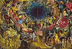 Šarūnas' work, by both critics and laymen, is often referred to as "different". However, the "difference" in Sauka's paintings is quite consistent. Sauka's imagery is rich with religious symbolism, sharp contrasts of colour, characters and objects in a state of decay. The images of blood, organs, severed body parts and butchery are often found in his paintings. This literal dissection or deformation of the human form is possibly an expression of the author's belief that the human must be stripped from conventional chains in order to contemplate the true condition of its body and soul. In many of his paintings, he uses his own face, sometimes faces of his family members or relatives; the victim and aggressor usually both have the same face.[1] A full appreciation of his artwork requires an understanding of the extent and cruelty of the communist terror in Lithuania and other countries of Eastern Europe and a grasp of some of the underlying metaphysical and archetypal ideas that are basic to his world view and sensibility.[2]