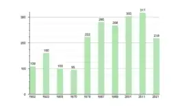 The population of Žerkščiai has remained roughly the same throughout the past 100 years, with its peak being in 2011 with 317 inhabitants[1] and its lowest being 95 in 1970. Between 1979[2] and 1989,[3] the population grew more due the neighbouring city of Venta opening up a lime and later a brick factory creating more job opportunities.