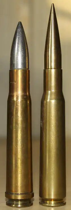 The .55 Boys is a 13.2×99mm Hotchkiss cartridge, necked up in the mid-1930s to accept a .55 caliber bullet.[1] Since the case was left with less of a shoulder, a belt was added to ensure reliable headspacing. The .55 Boys performed poorly compared to contemporary foreign anti-tank rounds, such as the German 7.92×94mm Patronen[note 1] and the Soviet 14.5×114mm rounds. As a result, it was quickly deemed obsolete.[2]