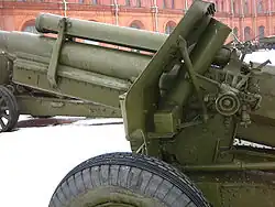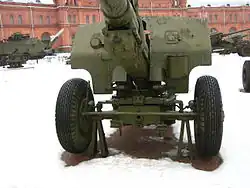 The barrel consisted of a loose liner and jacket which was screwed into the breech; the breechblock was of the interrupted screw type, borrowed from the 122 mm howitzer M1910/30. The variable length recoil system consisted of a hydraulic recoil buffer and hydro-pneumatic recuperator. The gun was fitted with segment-type elevation gear and screw-type traverse gear. The carriage was of the split trail type, with trolleybus-type wheels and rubber tires. To protect the crew from small arms fire and shell fragments, a shield was fitted.
