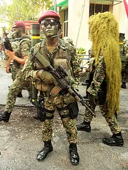 A paratrooper from the 10 PARA BDE of the Malaysian Army is holding his M4A1 carbine. Notice that the beret is worn in a style where the cap badge is not visible from the front. This style of beret is used by all elite units in Malaysia, including the 10 PARA BDE and all special forces. The style was first adopted by Gerak Khas during the Communist insurgency in Malaysia (1968–1989) and was inspired by the Royal Marines Commando Snipers team who served alongside Gerak Khas during the conflict.[24]