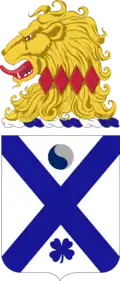 The shield is blue for the Infantry; the white saltire cross commemorates the service of the old regiment in the Civil War and the silver oak tree the service in World War I (Argonne Forest).