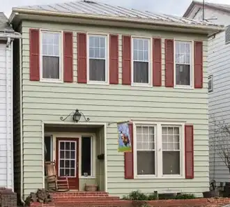 This building was originally the location of the Jacob Frank Carriage Shop. A two-story home with a hipped roof, resting on a stone foundation, it was designed with a front entrance that was wide enough to allow carriages to pass through. Although the structure has been vastly altered over the years, it still has its decorative eave brackets. Its original clapboards are now clad in aluminum siding. The home has an inset entrance and a paired window on the first story.