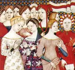 Married women in Northern and Western Europe wore some type of headcovering. The barbet was a band of linen that passed under the chin and was pinned on top of the head; it descended from the earlier wimple (in French, barbe), which was now worn only by older women, widows, and nuns. The barbet was worn with a linen fillet or headband, or with a linen cap called a coif, with or without a couvrechef (kerchief) or veil overall.[29] It passed out of fashion by mid-century. Unmarried girls simply braided the hair to keep the dirt out.