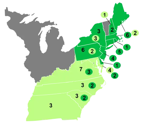 On April 6, 1789, the House and Senate, meeting in joint session, counted the electoral votes and certified that Washington had received electoral votes from each of the 69 electors that had cast votes, and thus had been elected president. They also certified that Adams, with 34 electoral votes, had been elected as vice president.[11] The other 35 electoral votes were divided among: John Jay (9), Robert H. Harrison (6), John Rutledge (6), John Hancock (4), George Clinton (3), Samuel Huntington (2), John Milton (2), James Armstrong (1), Benjamin Lincoln (1), and Edward Telfair (1).[12] Only ten of the thirteen states cast electoral votes; North Carolina and Rhode Island did not participate as they had not yet ratified the Constitution, while the New York legislature failed to appoint its allotted electors in time.[13]