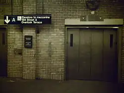 Additional elevators were announced between the platforms and mezzanine in December 2019 as part of the agency's 2020–2024 Capital Program[70] and were completed in 2023, making the station ADA-accessible.[56] Patrons with wheelchairs are able to traverse from this entrance to the passageway out to Overlook Terrace, as the elevators provide direct access to both the mezzanine and street level.[5]: 6 A ramp bypasses a short set of steps between the Overlook Terrace entrance and the passageway, making that entrance ADA-accessible.[56] There is a staircase available in case of an emergency.[5]: 5