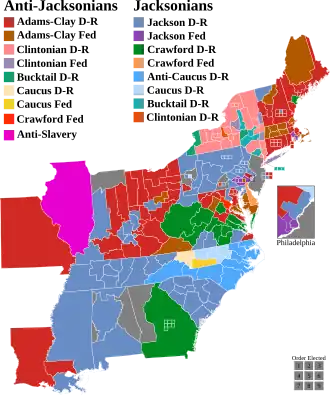 - ^ In the case of the Anti-Jacksonians (aka. Adams Men), there were 72 "Adams-Clay" Democratic-Republicans and 15 "Adams-Clay" Federalists, for a total of 87 Anti-Jacksonians, in the U.S. House before the 1824 election.
