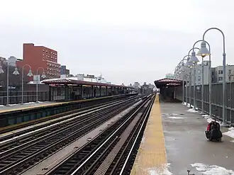 The 183rd Street station is a local station on the elevated IRT Jerome Avenue Line of the New York City Subway. Located at the intersection of 183rd Street and Jerome Avenue in the University Heights and Fordham Heights neighborhoods of the Bronx, it is served by the 4 train at all times. This station was constructed by the Interborough Rapid Transit Company as part of the Dual Contracts and opened in 1917.