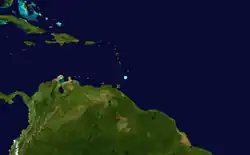 A publication by meteorologist Ivan R. Tannehill indicates that Tropical Storm Two was centered near Barbados on August 10.[3] However, due its weak nature – maximum sustained winds were only 45 mph (75 km/h) – only a single data point is known of the storm's path.[2] Climate researcher Michael Chenoweth argued in a 2014 study that this system remained a tropical wave.[4]
