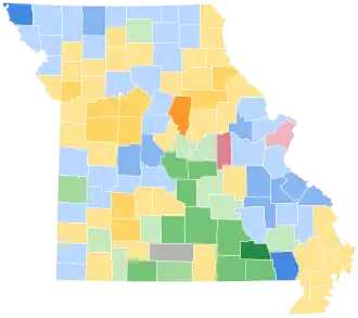 As of the 2020 presidential election, this is the last occasion when Putnam County, Ozark County, and Taney County voted for a candidate running as a Democrat, with the former voting for Douglas and the latter two voting for Breckinridge. This was also the last election until 1984 in which Monroe County did not vote for the Democratic candidate. This was the first time in American history that four candidates each won at least one county in the same state, something that has only been repeated in 1912 (in North Dakota and in Kansas).[1] Missouri was also the only slave state in which Lincoln won any counties.