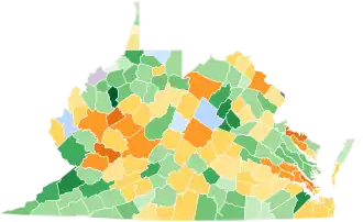 This was the first presidential election since the formation of political parties in which Virginia did not vote for the Democratic or Democratic-Republican candidate. It was also the closest presidential election result in Virginia history: Bell won by 156 votes, or a margin of 0.093474% – the thirteenth-closest statewide presidential result in United States history and the closest between 1836 and 1876. Virginia eventually seceded from the United States on April 17, 1861, and did not participate in the following elections in 1864 and 1868. However, unionist counties in the Ohio basin, plus a number of adjacent counties in the northwest, seceded to form the state of West Virginia and did participate in those two elections. As of the 2024 presidential election,[7] this is the last election in which Morgan County, one of the counties that broke off to form West Virginia, did not vote for the Republican candidate.