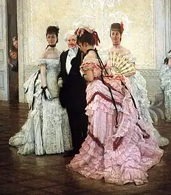 Under the influence of the Pre-Raphaelite Brotherhood and other artistic reformers, the "anti-fashion" for Artistic dress with its "medieval" details and uncorseted lines continued through the 1870s. Newly fashionable tea gowns, an informal fashion for entertaining at home, combined Pre-Raphaelite influences with the loose sack-back styles of the 18th century.[2]