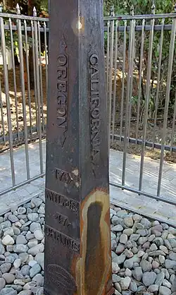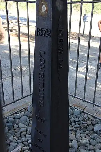 The 1872 marker near Verdi, Nevada is a four-sided cast iron pylon eight feet tall. It includes the words "CALIFORNIA" on the west face of the pylon, "NEVADA" on the east face, "1872, LONGITUDE 120 WEST OF GREENWICH, A.W. VON SCHMIDT, U.S." on the south face, and "170 MILES 47 CHAINS TO OREGON" on the north face.[4] (170 miles 47 chains is equivalent to 170.59 miles or 274.5 kilometres.)