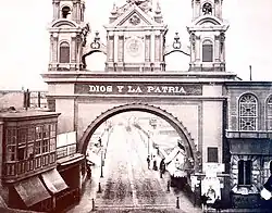 The Gate of Lima in 1872, with a pro-Gutiérrez poster to the right of its entrance.
