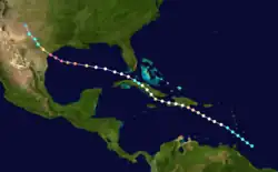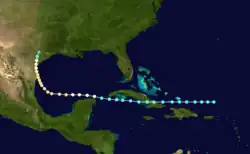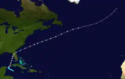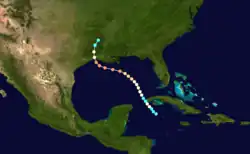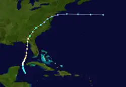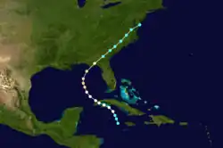 Little more than a day after the dissipation of the previous hurricane, a broad area of low pressure over the western Caribbean Sea developed into a tropical storm while centered about 180 mi (290 km) east-southeast of Punta Allen, Quintana Roo, Mexico.[11][24] Over the next two days, the storm meandered toward and through the Yucatán Channel, gradually intensifying as it proceeded to the north-northwest and north. Late on June 18, the system attained hurricane status off the western tip of Pinar del Río Province, Cuba. The following day, the cyclone turned to the north-northeast, producing "severe gales" (47–54 mph, 76–87 km/h) over the waters off Cuba and Jamaica, as reported by ships.[20] At 00:00 UTC on June 20, the storm reached its peak intensity of 100 mph (155 km/h), and shortly afterward its forward speed accelerated. At 11:00 UTC on June 21, the cyclone made landfall near St. Marks, Florida, as a Category 2 hurricane. The storm gradually decreased in intensity over the next day and a half as it crossed the Southeastern and Mid-Atlantic states. By 18:00 UTC on June 23, the system passed about 70 mi (115 km) southeast of New York City and curved to the east before dissipating a day later.[11]