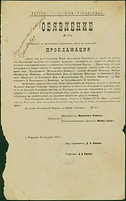 The Bulgarian coup d'état of 1886, also known as the 9 August coup d'état (Bulgarian: Деветоавгустовски преврат, Devetoavgustovski prevrat) was an attempted dethronement of Knyaz Alexander Battenberg in Principality of Bulgaria, carried out on 9 August 1886. Although unsuccessful, the event led to the abdication of Alexander Battenberg.[1][2]