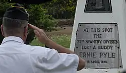 The 1892nd departed New Guinea on LSTs on 5 June 1945 with a destination of the Ryukyu Islands. On 22 June the unit arrived at Ie Shima (Iejima), a small island off the northwest coast of Okinawa, where it would spend the remainder of the war working on runway maintenance projects and guarding airfield assets.[1] The island housed a 5,000+ foot runway that was constructed out of coral quarried from the island's interior; the runway was utilized by bomber aircraft groups. The battalion was stationed near the site of war correspondent Ernie Pyle's death. Pyle had been killed by a hidden Japanese machine gunner during the initial landing on the island. At the time of his unit's arrival the grave site was marked by an upturned rifle stuck in the mud with Pyle's helmet on it. It was later marked by a monument created by the 77th Infantry Division.[3]