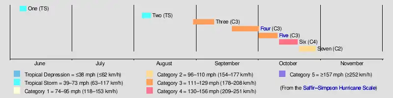 Seven October 21–29 Category 2 hurricane 110 (175) 955 Bahamas, Florida, Bermuda Unknown None