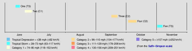 | 5 systems | June 12 – November 6 | 105 (165) | 970 | Unknown | 5 | |||||