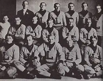 Lally and Fenton had both previously played for Mansfield Normal School,[3] and Lally was one of the best blockers for Fenton.[16][19] One of Fenton's favorite plays was the "tackle over tackle" play. In this play, Fenton faked a handoff to a back, then gave the ball to a tackle and led the blocking behind the other tackle.[20] "Doc was the hub," recalled captain and tackle Marshall 'Cap' Gandy, "and we were the spokes."[20] Fenton earned the reputation of doing everything well with a football.[19]
