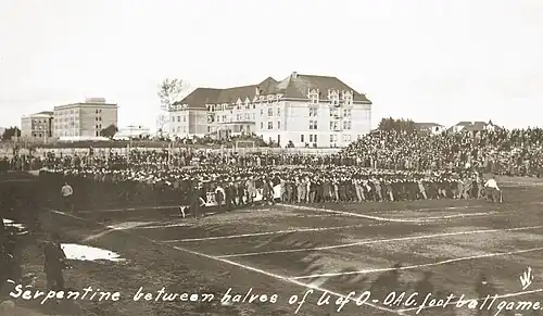 In the second quarter, Oregon's captain, a right halfback named Taylor, broke free on a 47-yard run, setting up a trick play that crossed the goal line.[15] The 5-point touchdown was supplemented with a successful goal after the score, bringing the Oregon lead to 9–0, the lead at halftime.[15] During the intermission, the OAC rooters took over the field to do their signature "serpentine" dance, with a live goat lead at the head of the procession to emphasize the rally squad's slogan, "Oregon can't get our goat!"[17]