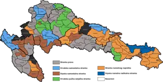 ![]() Results of the election in each of the electoral districts in 8 counties of the Kingdom of Croatia-Slavonia: the party with the plurality of votes in each district. Party of Rights Croatian Independent Party Serb Independent Party Party of People's Progress Croatian Peoples' Peasant Party Serb People's Radical Party Independent | |||||||||||||||||||||||||