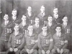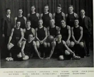 Coached by Ralph Jones, the 1914–15 Fighting Illini men's basketball team became the first undefeated Big Ten champion in the history of the school as well as the fourth Big Ten National Champion.[1] That 1915 season was the third in the eight-year tenure of head coach Ralph Jones and it produced the only unbeaten season in Illini history and the first Big Ten title for the Illinois basketball program. The Illinois team was retroactively named national champions by the Helms Athletic Foundation and the Premo-Porretta Power Poll.[2] Jones’ 1915 team scored twice as many points as its opponents and won the conference title by three games over Chicago. The arrival of the Woods brothers in 1914 had a lot to do with the success of this era. Guard Ray Woods was named first-team All-America all three years he competed (1915–17), and twin brother Ralf, a forward, led the team in scoring in both 1916 and 1917. His consistency at the free throw line led to the establishment of the Ralf Woods Award, which is still given annually to the Fighting Illini player with the best free-throw percentage. The starting lineup included Frank Bane at center, Clyde Alwood and Edward Allan Williford at the forward positions, captain Sven Duner at guard and brothers Ralf Woods and Ray Woods. Ray Woods was named an All-American during this season.[3]