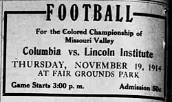 - ^ "Columbia Negroes Win". University Missourian. Columbia, Missouri. November 20, 1914. p. 3. Retrieved October 11, 2024 – via Newspapers.com