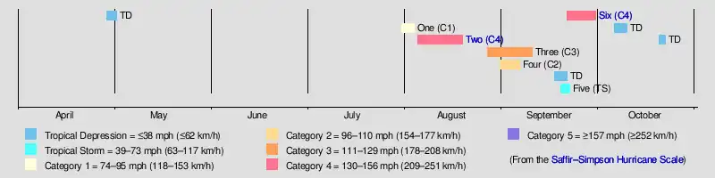 Overall, the season featured 10 known tropical cyclones,[2] 6 of which became tropical storms, while 5 of those intensified into hurricanes. Further, 3 out of the 5 hurricanes reached major hurricane status according to the Saffir–Simpson scale.[3] However, because the early 20th century lacked modern forecasting and documentation, the official hurricane database may be incomplete. The Atlantic hurricane reanalysis project in 2008 uncovered evidence for a tropical cyclone not previously in the database, Tropical Storm Five. Additionally, Hurricane One had previously been classified as a tropical storm, though the project resulted in it being upgraded to hurricane status. The season proved to be devastating despite having only six systems reaching at least tropical storm intensity, with four out of the five hurricanes striking the United States.[2] The Galveston hurricane was the strongest and first Category 4 hurricane to make landfall in the United States since the 1900 Galveston hurricane.[4] Collectively, the tropical cyclones of the season caused at least 708 fatalities and more than $43.35 million in damage.[5]