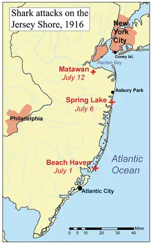 The Jersey Shore shark attacks of 1916 were a series of shark attacks along the coast of New Jersey, in the United States, between July 1 and 12, 1916, in which four people were killed and one critically injured. The incidents occurred during a deadly summer heat wave and polio epidemic in the United States that drove thousands of people to the seaside resorts of the Jersey Shore. Since 1916, scholars have debated which shark species was responsible and the number of animals involved, with the great white shark and the bull shark most frequently cited.