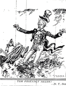 After the first fatality, newspaper cartoonists began using sharks as caricatures for political figures, German U-boats, Victorian morality and fashion, polio, and the deadly heat wave threatening the Northeast at the time. Fernicola notes, "Since 1916 was among the years that Americans were trying to break away from the rigidity and conservatism of the Victorian period, one comic depicted a risqué polka-dot bathing suit and advertised it as the secret weapon to keep sharks away from our swimmers." Another cartoon depicted "an exasperated individual at the end of a dock that displays a 'Danger: No Swimming' sign and mentions the three most emphasized 'danger' topics of the day: 'Infantile Paralysis (polio), Epidemic Heat Wave, and Sharks in the Ocean'." The cartoon is entitled "What's a Family Man to Do?"[64] With World War I ongoing in 1916 and America's growing distrust of Germany, cartoonists depicted U-boats with the mouth and fins of a shark assaulting Uncle Sam while he wades in the water.[65]