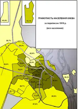 The most numerous ethnic groups in the city were found to be Russians, Ukrainians, and Jews.[1] The percentage of those identifying as Ukrainians within Kiev in 1919 increased from 12% to 24% when compared to the results of the 1917 census, while the percentage identifying as Russians fell from 50% to 42%.[3][4]