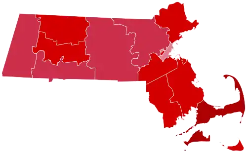 In 13 of the state's 14 counties (all but Suffolk), Harding broke 60% of the vote, and in nine, Harding broke seventy percent. He even reached eighty percent in the island county of Dukes and peninsular Barnstable.