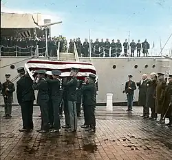 Unknown Soldier from World War I being taken from the USS Olympia (C-6) at the Washington Navy Yard and transported to the US Capitol to lay in state. On November 11 the body is interred at Arlington National Cemetery.