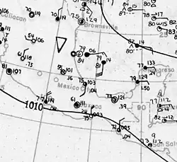 Historical weather maps suggest that a tropical depression developed about 85 mi (135 km) north-northwest of Barranquilla, Colombia, early on October 11. The depression moved slowly westward and then northwestward without significant intensification for a few days. By October 15, the depression had reached tropical storm status. Late on October 16, the cyclone began intensifying at a quicker pace, becoming the equivalent of a modern-day Category 2 hurricane on October 17. Around 00:00 UTC the next day, it peaked with maximum sustained winds of 110 mph (180 km/h).[6] Early on October 18, a ship reported a minimum pressure of 984 mbar (29.1 inHg) near the center, the lowest pressure measured during the life span of the storm.[3]