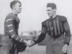 Lynn Bomar and Jess Neely are often acknowledged as the players of the game for Vanderbilt.[59] Lynn Bomar spent much of his day tackling Michigan's runners for a loss,[60] and "tore through the Wolverine line constantly, and always emerged after a play on the far side of the defense."[56] while Jess Neely was a battered and bruised captain playing so hard despite his injured frame.[43][60][n 2] Other plays of note for the Commodores included the shifty moves of Gil Reese—Reese made 105 yards on punt returns.[61] The yearbook spoke of Reese's play, "Time after time Gil Reece caught punts, and shifting from side to side in a most elusive fashion, would run almost through the Michigan team, by a hair's breadth, escaping each hand outstretched to seize him. He resembled old Lewis Hardage, who taught him that shifty trick." Scotty Neill's punting matching that of Kipke,[62] with an average of 42 yards per punt,[45] was also of note. The defense of Tex Bradford and Tot McCullough received praise.[43][44][56][60] Walter Camp noted the strong showing of Vanderbilt, particularly impressed with Reese's punt returns and McCullough's run defense. He credited McGugin with having developed a well-trained line, and a secondary that was not far behind.[63]