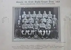 At the annual meeting on April 9 the report and balance sheet was presented. It was noted that despite there being rain on ten Saturdays during the 1934 season there was a “marked increase in ground and grandstand receipts”. The working account balance had improved from £762 7/9 in 1933 to £1,254 0/9 by the end of 1934 with gate and grandstand returns totalling £2,814 10/3. The league's assets were valued at £10,983 16/7 made up from Carlaw Park (£6,980 11/2), grandstand (£3,686 10/9), furniture and fittings (£101 6/2), and plant and gear (£181 13/10), which left a profit of £435 18/4. Adjustments to the players’ insurance scheme and fewer accidents saw a saving of over £70. The league gave £429 17/3 to the clubs which was slightly up on the 1933 season. The report also noted the retirement of Messrs. F. Ellis (treasurer), T. Davis (secretary, Junior Control Board), and to Mr. Vic Simpson (secretary, Referees Association).[2] The following were elected as officers for the 1935 season: patron, Mr. J.B. Donald; vice-patron, Mr. J.F.W. Dickson; president, James Carlaw; chairman, Mr. Grey Campbell; deputy chairman, Ted Phelan; vice-presidents, Messrs R.D. Bagnall, R. Benson, J. Bellamy, O. Blackwood, J. Donald, C. Drysdale, H. Grange, R.J. Laird, W.J. Lovett, John A. Lee (M.P.), J. Montgomery, E. Morton, Joe Sayegh, C. Seagar, Bill Schramm (M.P.), R.T. Sharman, W. Wallace, H. Walmsley, G.T. Wright, R.H. Wood, G.C.Gilmore, and Webb; club delegates to the board of control, J.W. Probert, and Jim Rukutai; referees’ delegate, William Mincham.[3] In mid April Mr. Ernest Davis, and Mr. T.G. Symonds (managing director of George Court and Sons Ltd.) were elected vice-presidents of ARL.[4]
