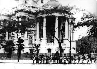 On the morning of 10 November 1937, cavalry of the Federal District police force surrounded the Congress and blockaded the entrance, preventing congressmen from entering.[75] Dutra was against using the Army in this operation.[42][75] One visitor trying to get into the Monroe Palace, the former seat of the Senate, was told by a guard, "When a senator cannot enter, then how can a stranger enter?"[76] As the congressmen were the best paid officials in the state, Vargas claimed he saved money by sending them home.[22] The president of the Senate was informed of his body's dismissal.[65] At 10:00 a.m., copies of the new constitution were printed and distributed amongst the cabinet; they were asked to sign it. The sole dissident, Odilón Braga, the minister of agriculture, resigned immediately and was replaced by anti-Oliveira paulista Fernando Costa.[53][65][77] Dutra, meanwhile, praised the "lofty mission entrusted to the national armed forces".[78] Many military personnel resigned, notably Colonel Eduardo Gomes.[78] Almost every state retained their pre-coup interventors, notably Minas Gerais, where Valadares was the politician most involved with the coup. Interventors in Rio Grande do Sul, São Paulo,[e] Rio de Janeiro, Bahia, and Pernambuco, however, were replaced.[78]