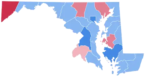 | Wicomico | 7,198 | 59.92% | 4,741 | 39.47% | 73 | 0.61% | 2,457 | 20.45% | 12,012 |
